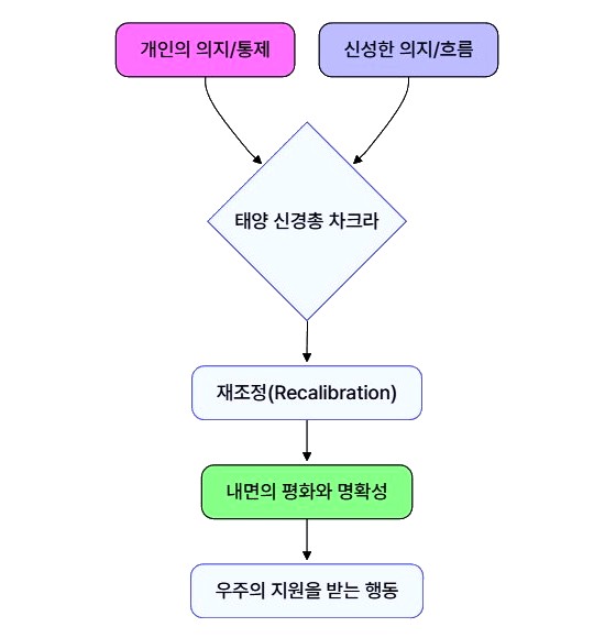 - 태양 신경총 차크라가 개인 의지에서 신성한 의지의 근원으로 재조정됨