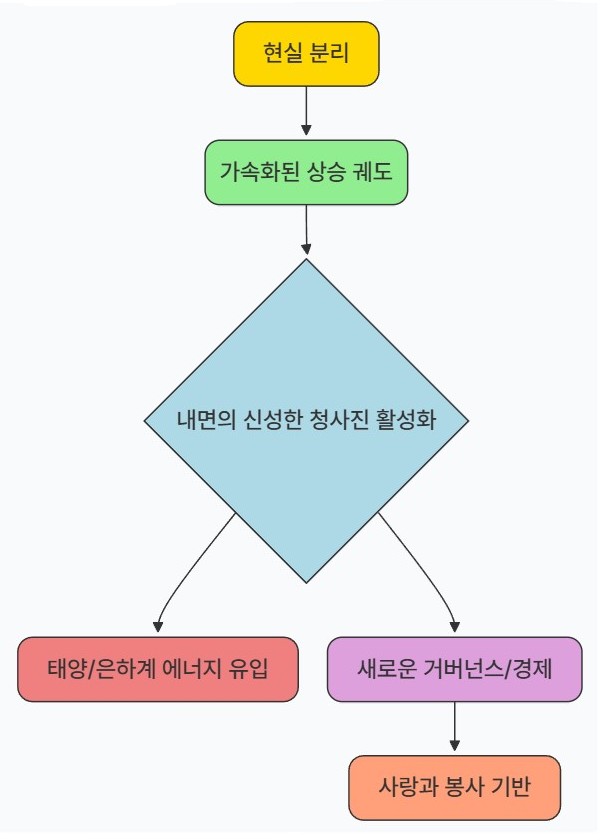 지구의 현실이 두 갈래로 나뉘는 중이며, 깨어난 영혼들은 내면의 신성한 청사진을 활성화하여 새로운 의식과 조화로운 사회를 창조하는 가속화된 상승 궤도에 진입하고 있습니다. 이 과정은 태양과 은하계의 빛 에너지를 통해 개인의 영적 능력을 일깨우고, 사랑과 봉사를 바탕으로 한 새로운 지구 거버넌스와 경제 시스템을 구축하는 것을 목표로 합니다.